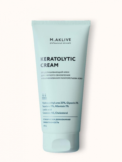 Крем-кератолитик предназначен для коррекции нарушений ороговения кожи, которые приводят к фолликулярному гиперкератозу (эффекту "гусиной кожи"), вросшим волосам, локальным участкам с огрубевшей кожей, комедонам, трещинам и шелушениям. Эти состояния требуют интенсивного смягчения и ускорения отшелушивания клеток кожи с поверхности